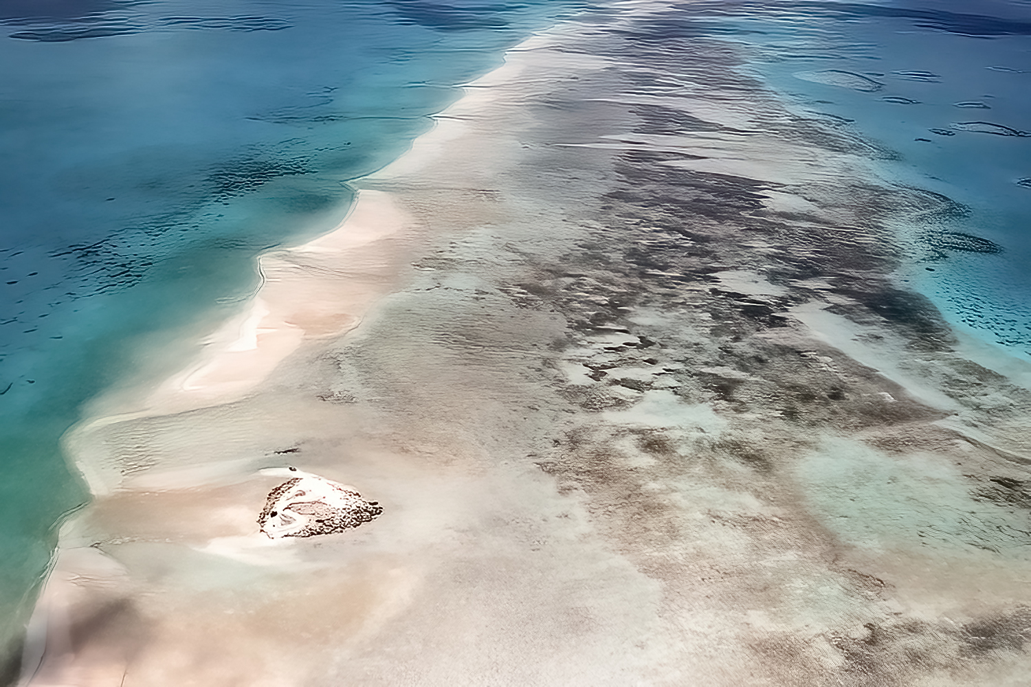 The coral in the lagoon here forms underwater formations that extend all the way to the western reef. The water shimmers with strange, almost unreal combinations of colors, best admired from the sky.