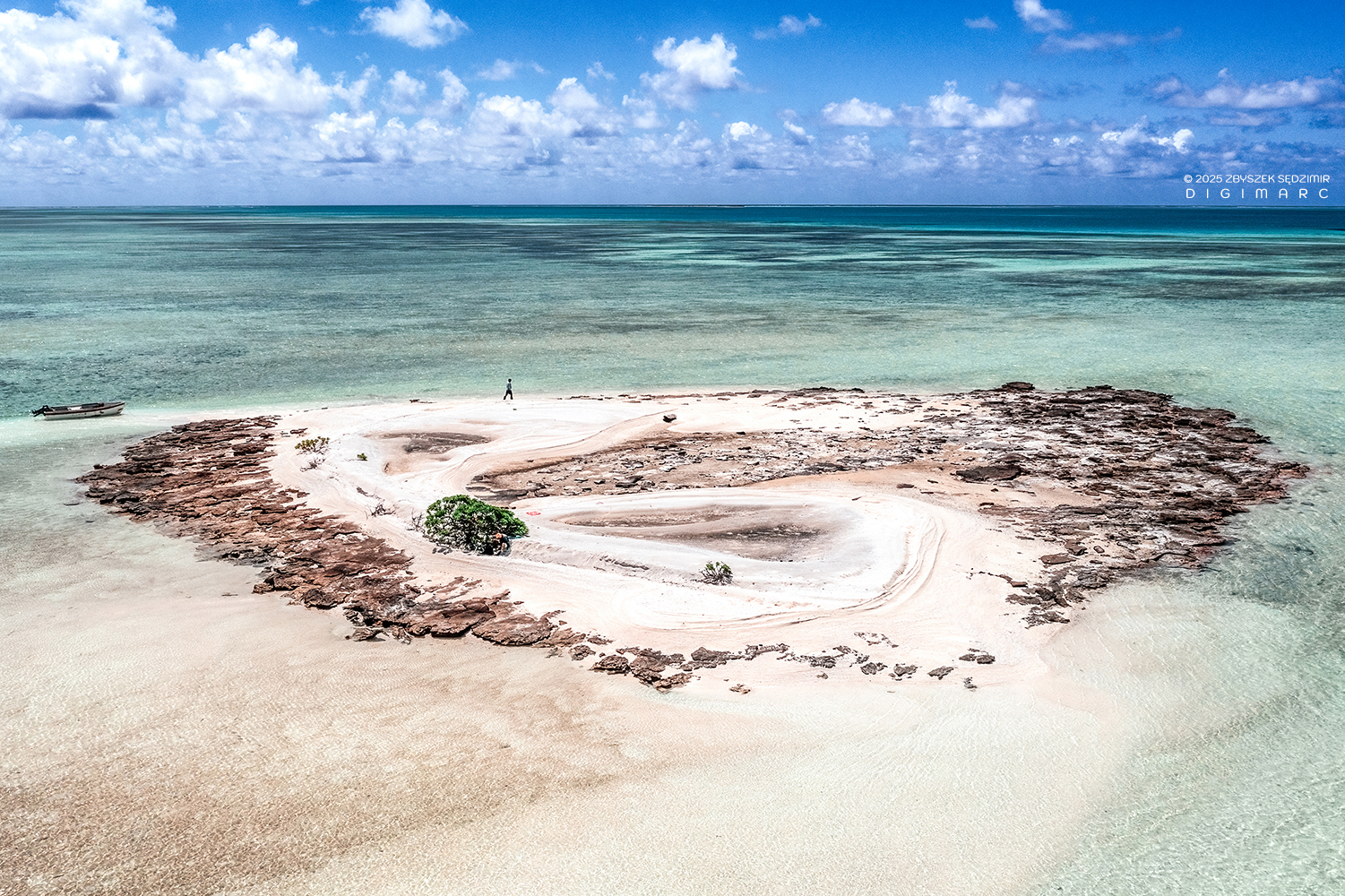 A tiny island almost without vegetation. In the shallow water around it are Hawksbill turtles.