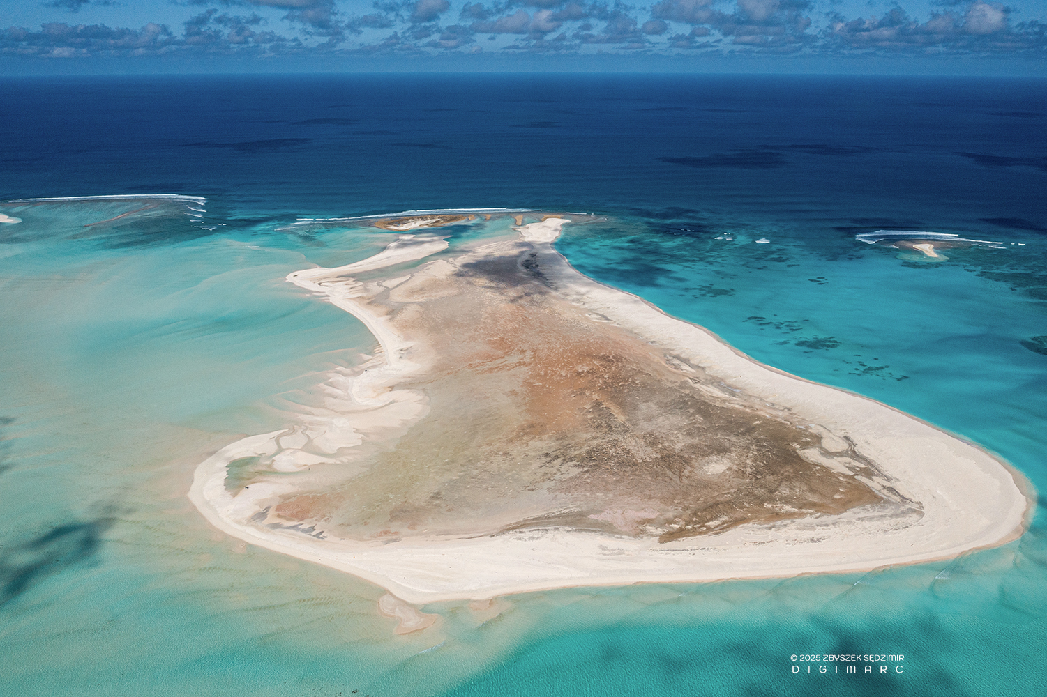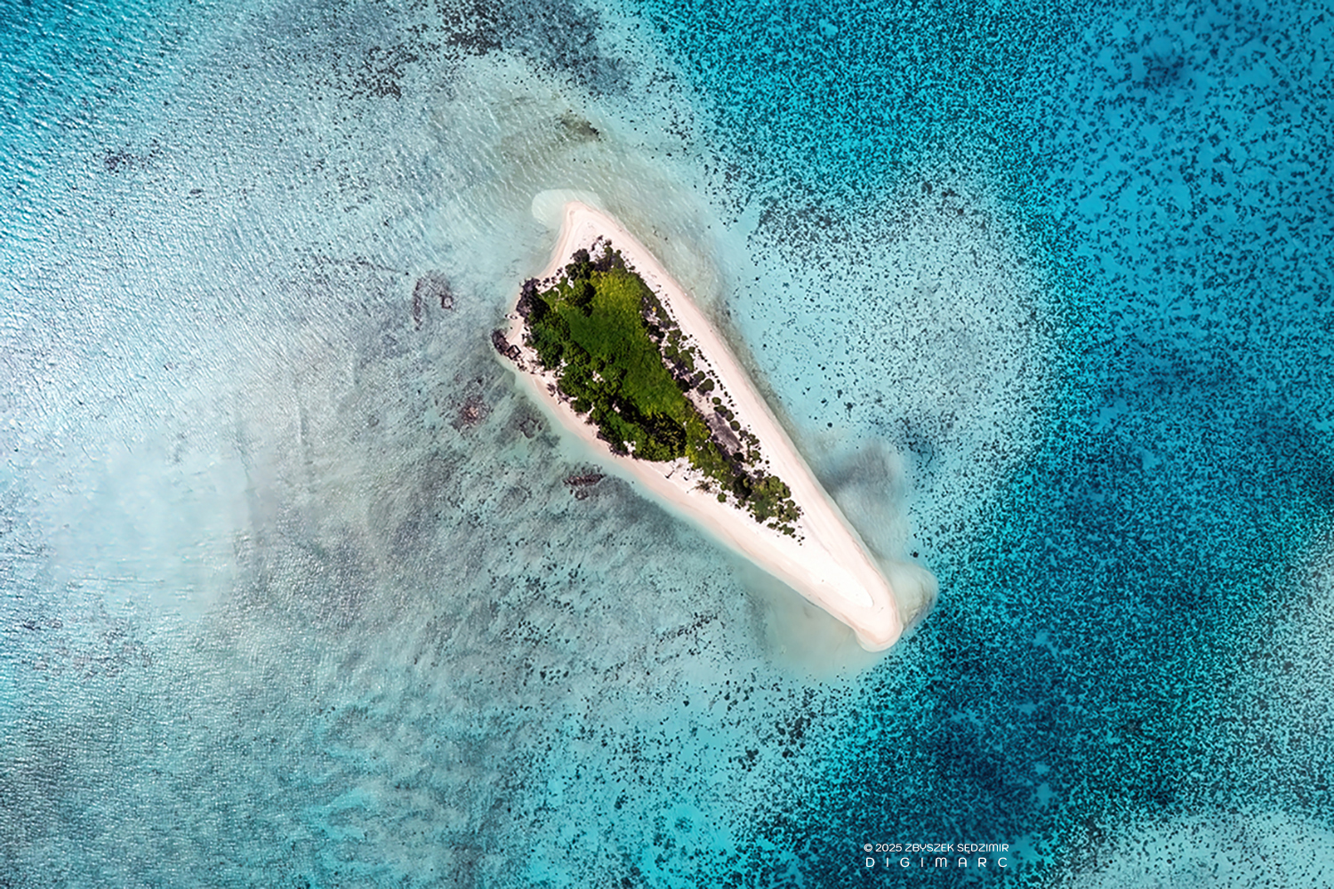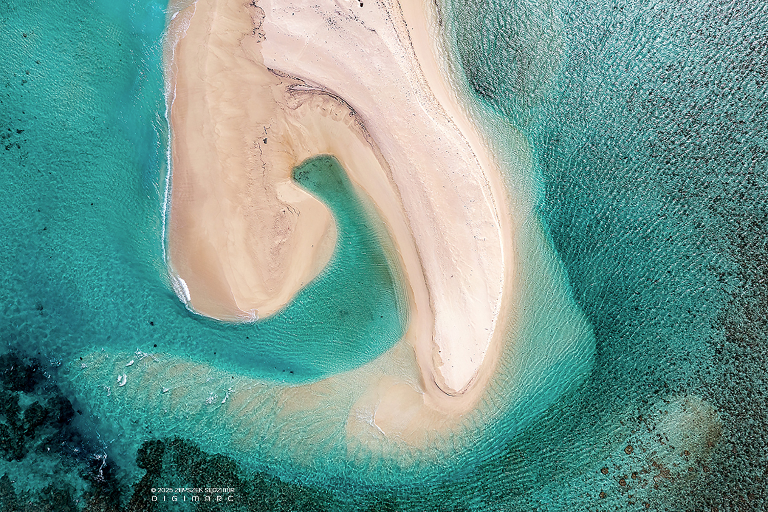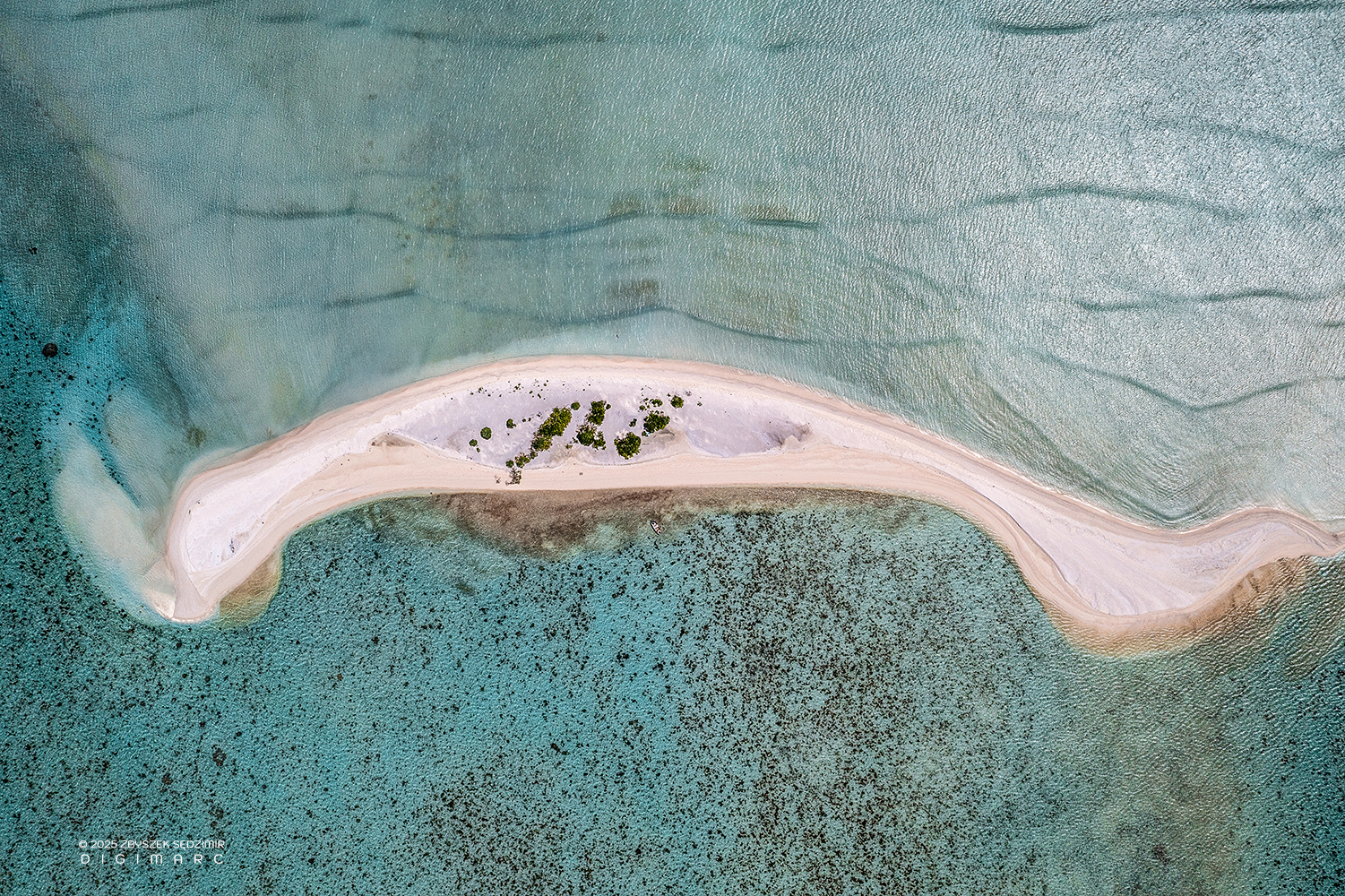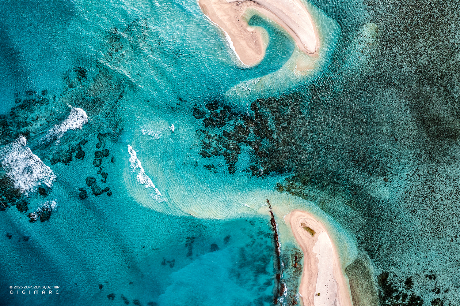 Souths end of CoCo Island. The interplay between reef, beach, and sea creates fluid lines and gradients — a natural abstraction shaped by currents and tides in one of Mauritius’ most isolated coral island groups.
