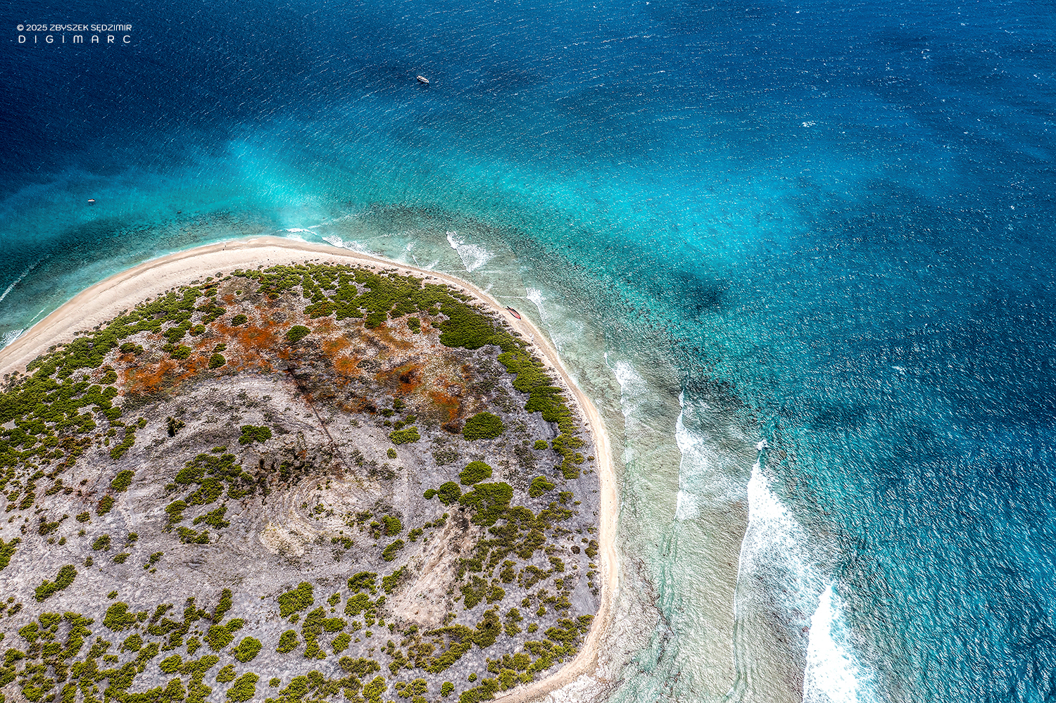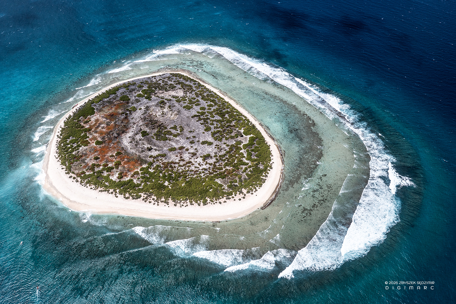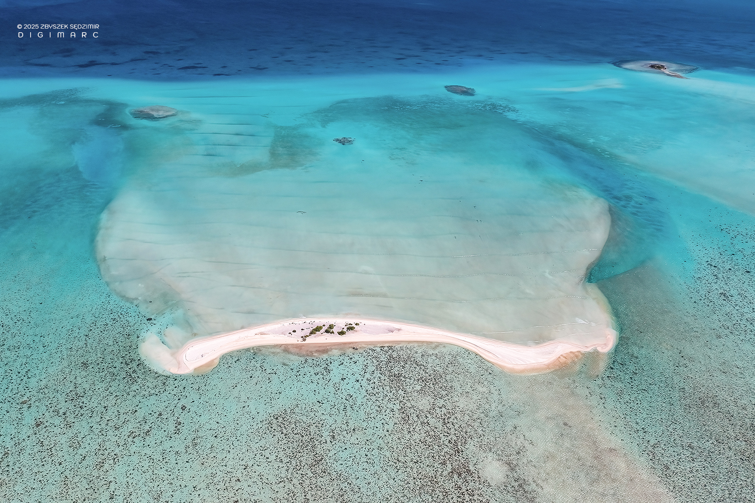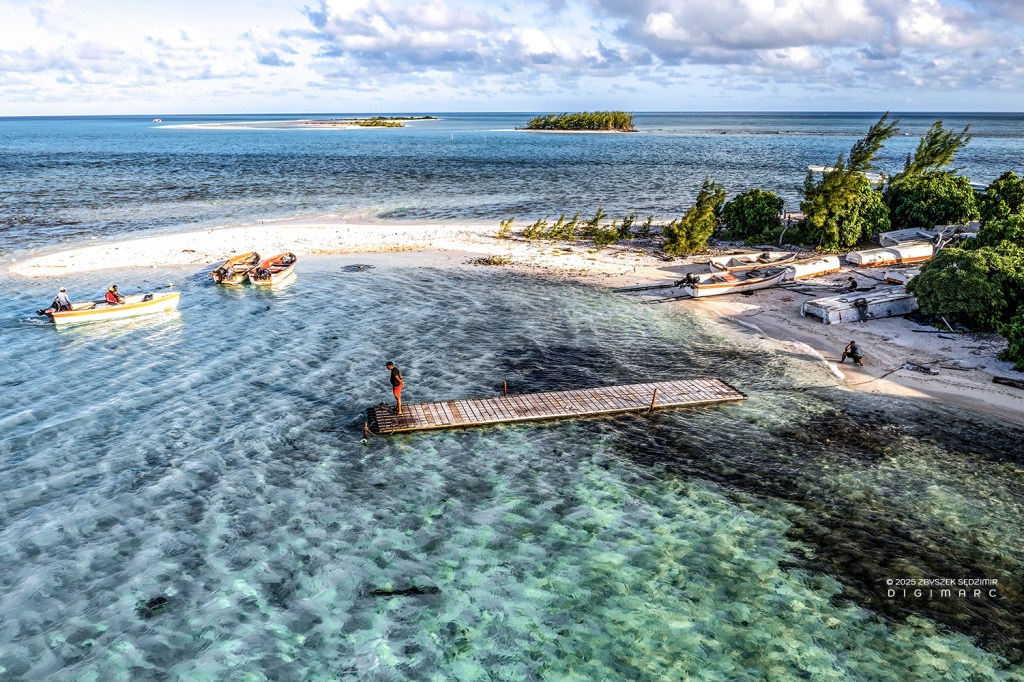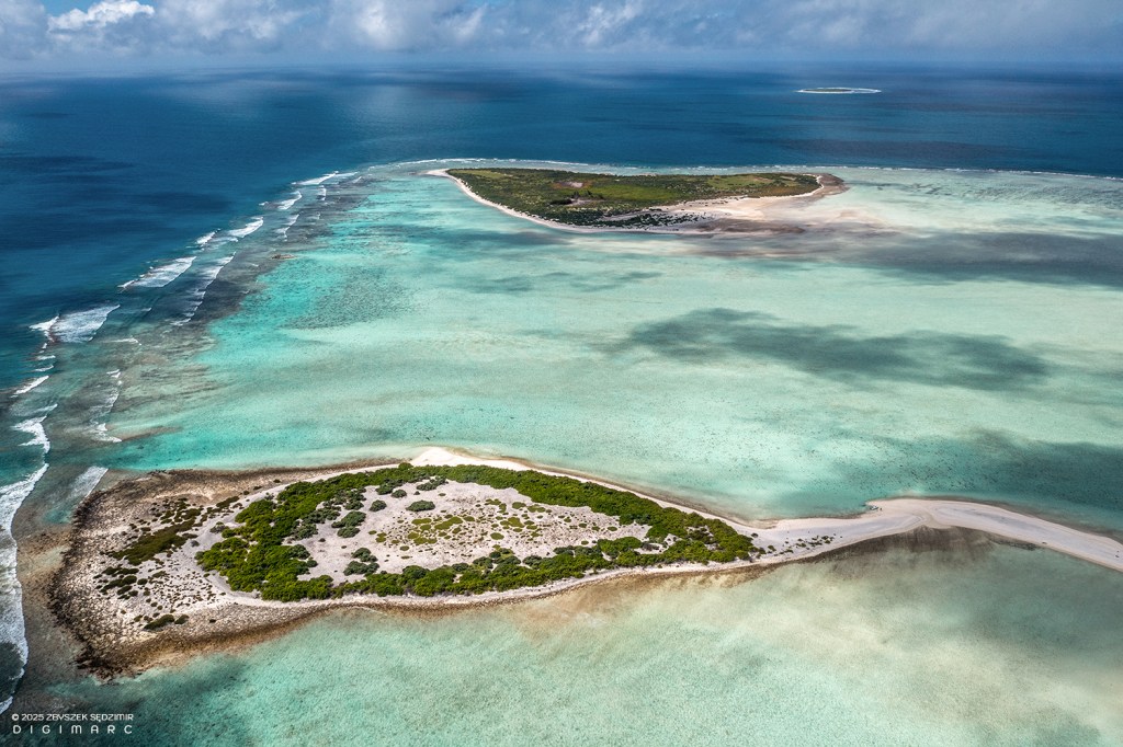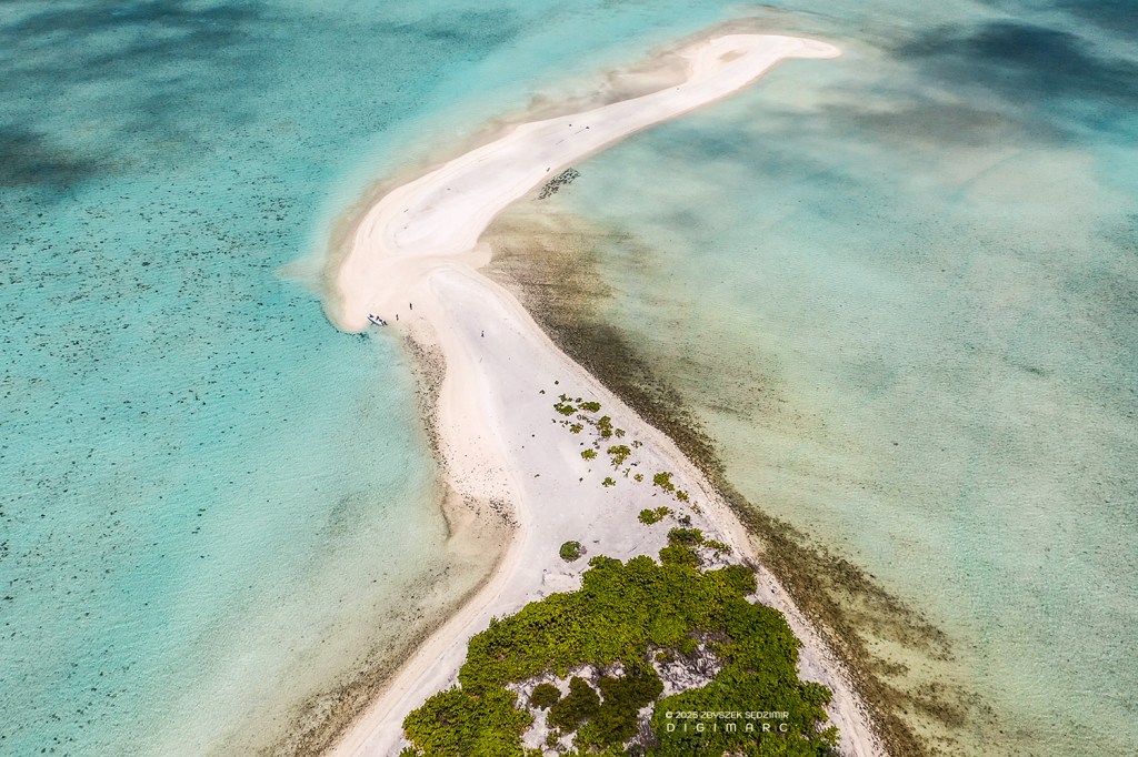 Another Tectec islet, briefly visited and seen from above. Below, the lagoon reveals a mesmerizing display of colors, shifting with the tides and changing light. In the upper right, Courson Island stands resilient against the vast ocean, its distinctive “tail” stretching into the water like a natural breakwater.