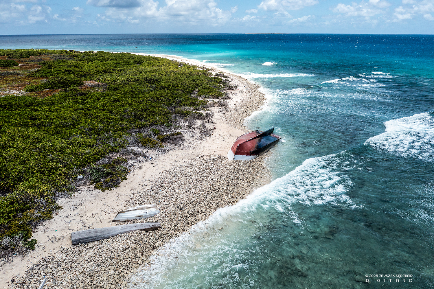 To conclude our visit to the Tectec islets, here’s one last aerial view toward the east. Seeing the mesmerizing beauty of the lagoon, with its abstract color combinations that could easily pass for a piece of modern art, it’s hard to understand why the Portuguese sailors of the early 16th century named the atoll “Cargados Carajos Baixos” (Cursed Shoals). However, reading the accounts of those who survived a major storm or a cyclone passage on the atoll quickly makes it clear. In January 1948, during the cyclone, Avocaire Island was submerged under two meters of water. Of the four fishermen who were there at the time, only one survived. Another reason for the name was undoubtedly the fact that the archipelago, devoid of any elevations or landmarks, was a perfect trap into which ships still fall to this day.