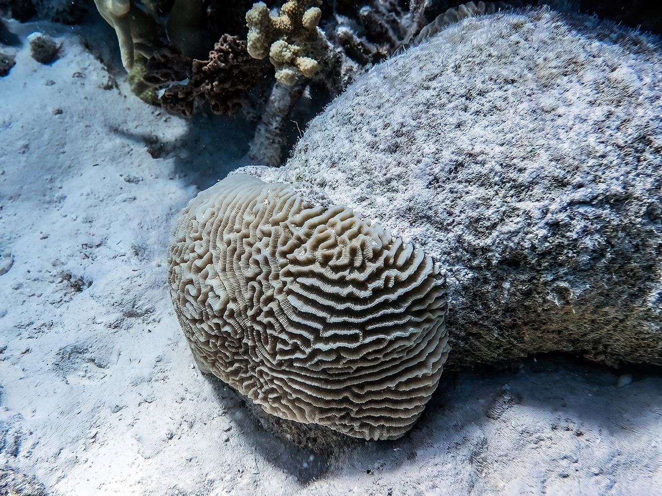 A massive brain coral, likely from the genus Platygyra, resting on the sandy reef between Chaloupe Island and Coco Island, its maze-like structure shaped by decades of slow growth.