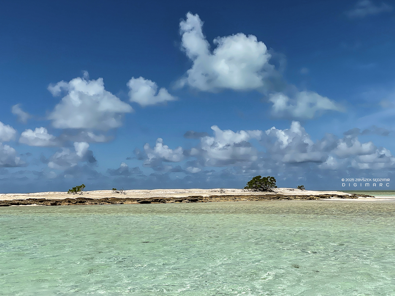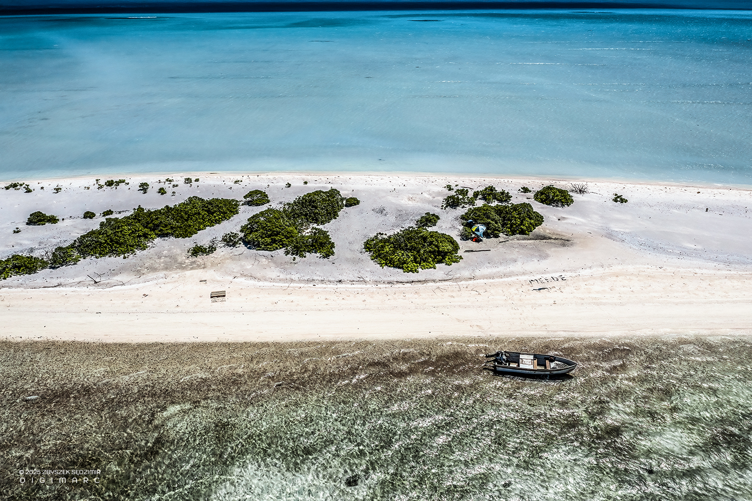 Petit Dagorne Island is a delicate sandbank of fine, pale sand, composed of crushed corals and shells and dotted with sparse vegetation. The view is directed toward the southern end of the archipelago; our pirogue appears on the left side of the image.