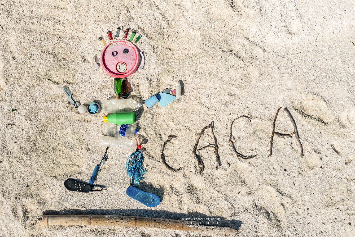 And as a farewell gesture, here’s a close-up of my “masterpiece,” so you can admire its fine ingredients—flip-flops, lighters, plastic bottles, glass vials, a toothbrush, and whatever else the ocean saw fit to throw in.