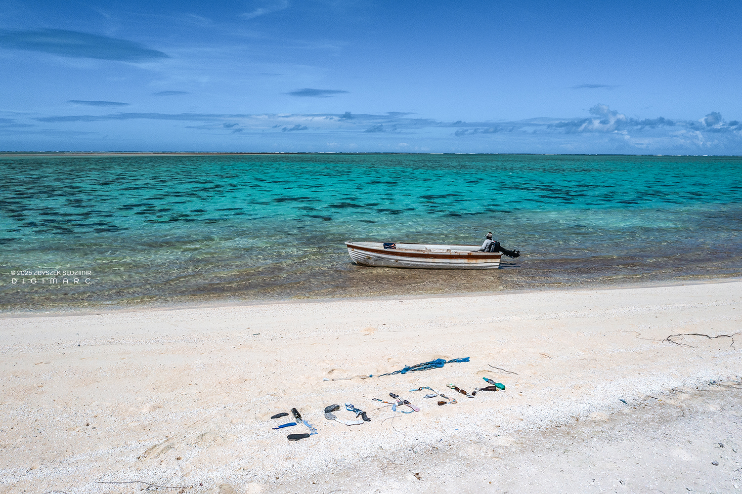 From this height, you can start picking out details on the surface of our Tectec islet. In the foreground, there’s the pirogue that brought us here. A little farther up, on the island itself, you can spot the umbrella we huddled under for shelter from the merciless sun. And then, of course, there’s something you could find on every single island in the archipelago, no matter how small—trash. To the left, a large wooden pallet lies on the beach—not exactly picturesque, but at least not an immediate threat to the environment. On the right, however, just above our pirogue, is something else entirely—the result of my growing frustration with the ever-present plastic pollution.