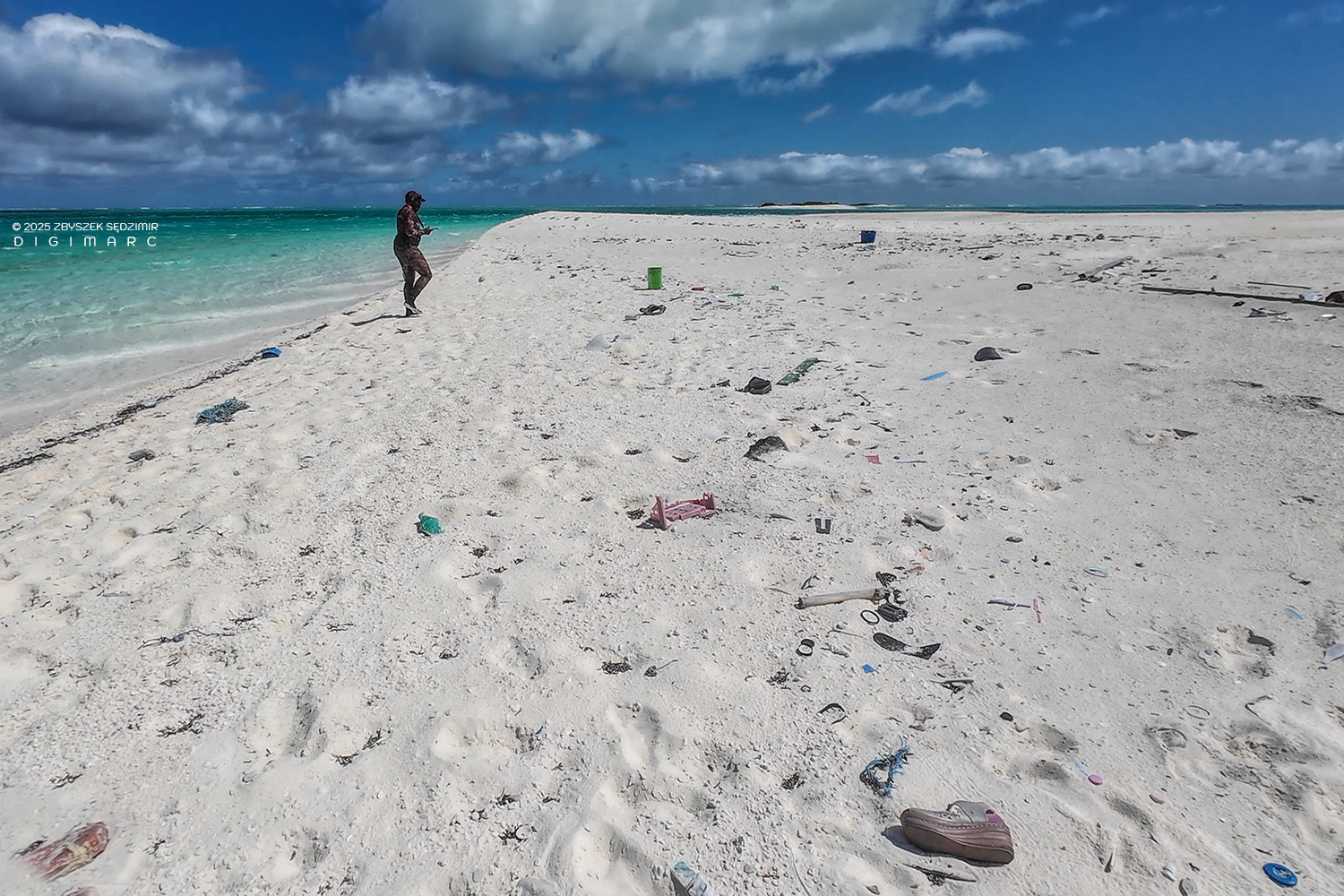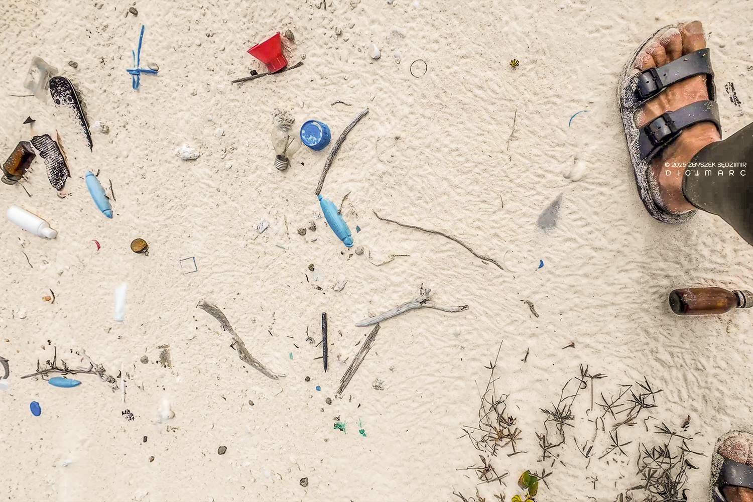 As on many other islands in the archipelago, the shift in perspective—from aerial to ground level—comes as a shock. Beneath our feet, the beautiful cantaloupe-colored sand is riddled with plastic, or more precisely, plastic debris.