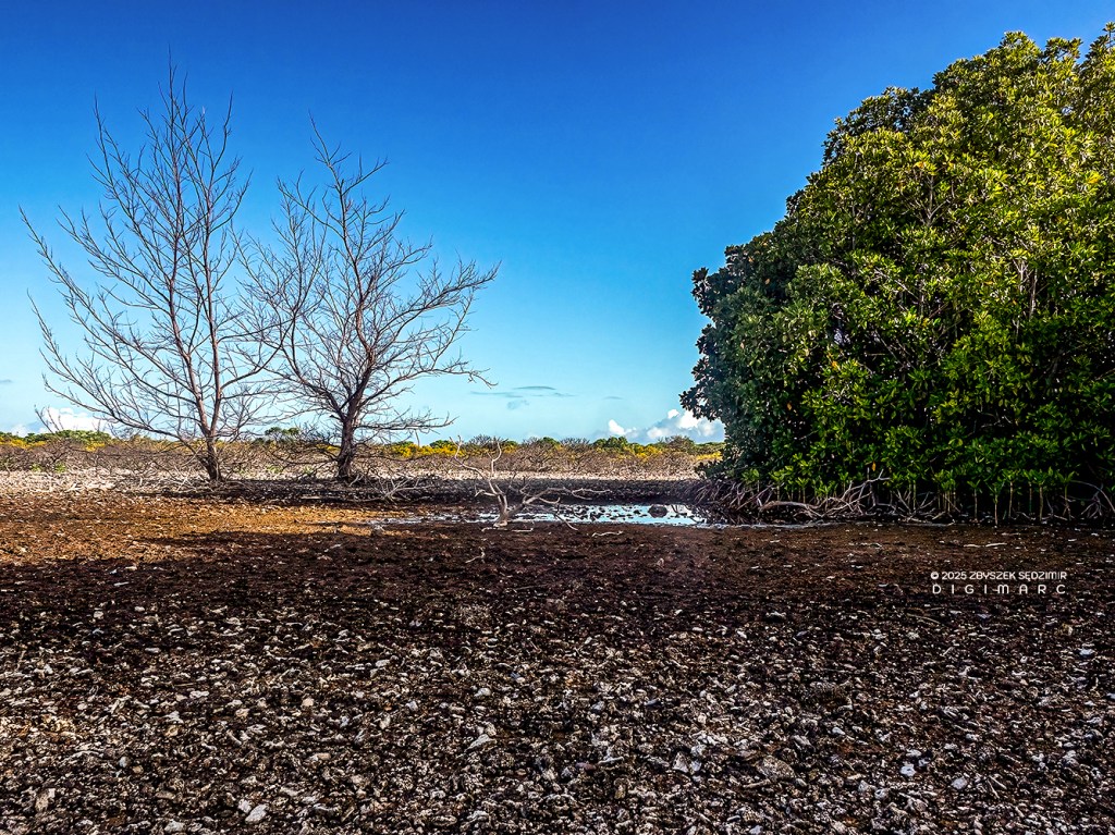 When we reached the mangroves, it became clear that the ground beneath and all around them was thoroughly soaked with salt water. A fine arrangement for the mangroves, no doubt—but not so much for the other trees and plants, which had withered away, unable to survive in an environment that played favorites.